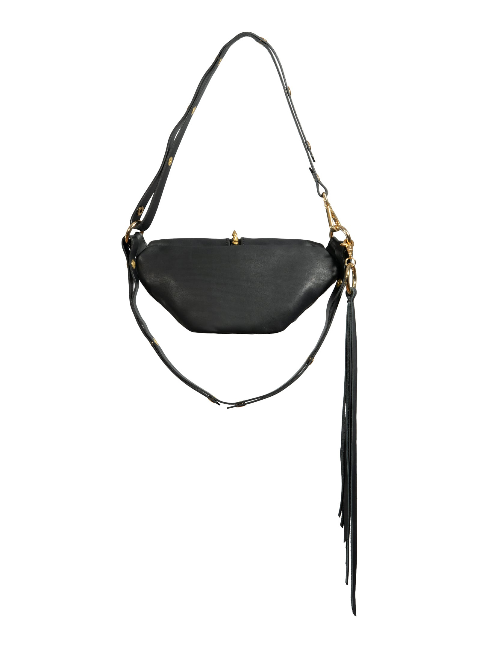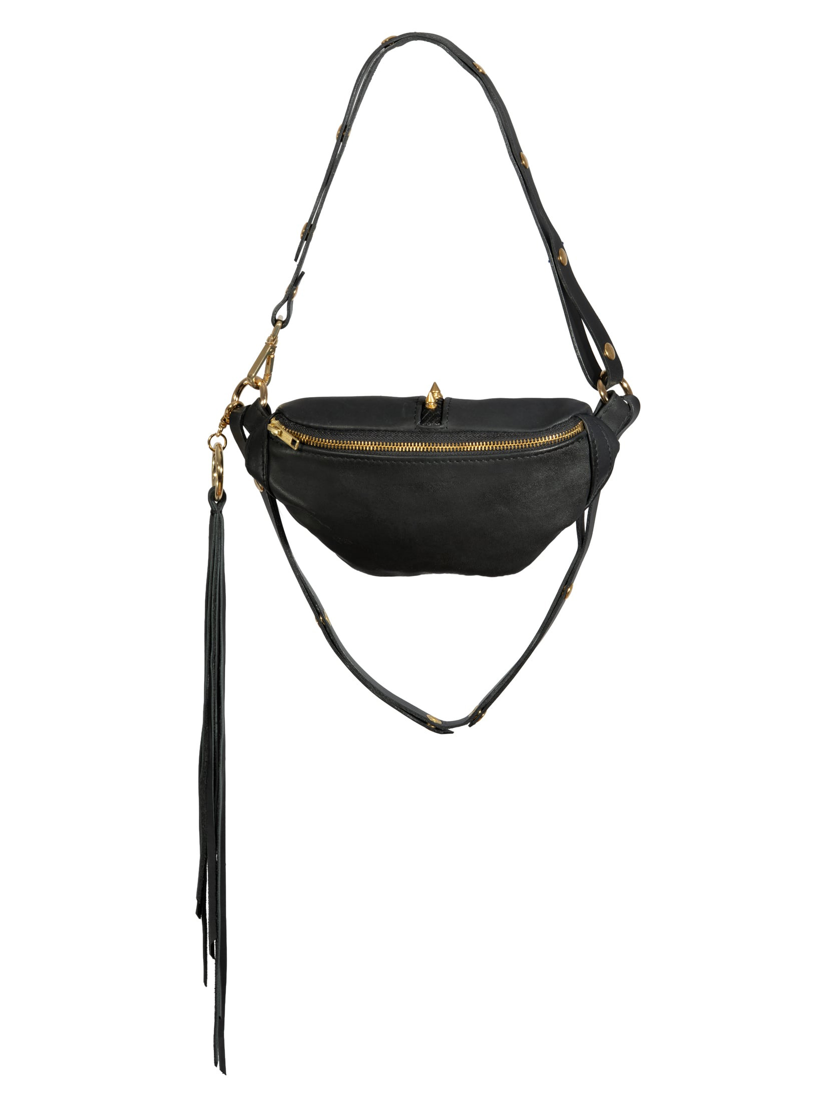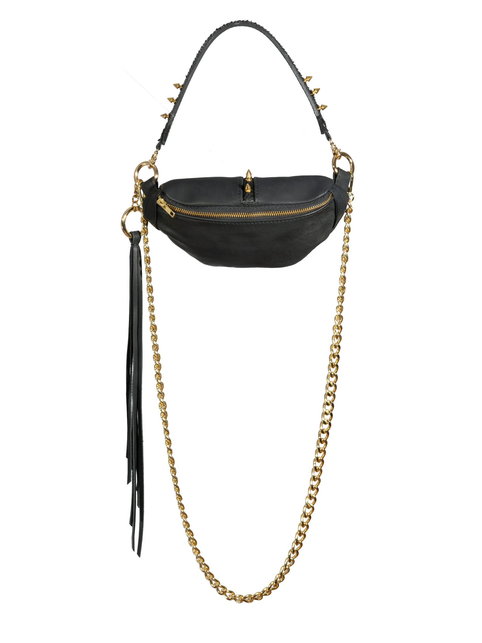 This IS NOT YOUR AVERAGE BUMBAG. It comes with two basic leather straps that allow you to wear it, around your waist, crossed over your chest and on the shoulder. Use the thinner strap around your body to create harness-like looks.
